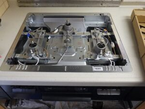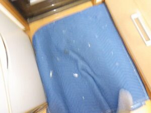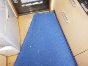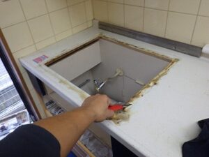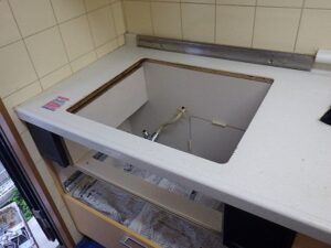 既存のガスコンロを取り外してキッチンの天板を掃除します