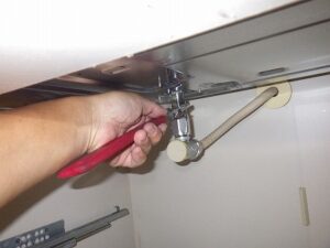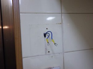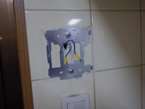 浴室リモコンの水平を確認しながら、ビスで壁に固定します