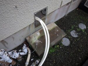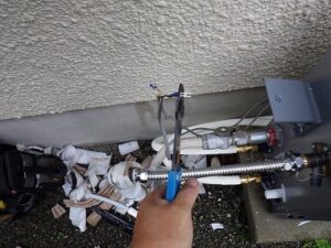 電源2つ穴の配管などを取り外して給湯器を撤去します