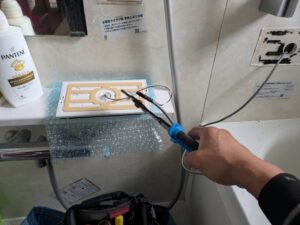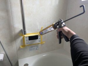 浴室リモコンの周りに防水のコーキングを打ちます