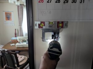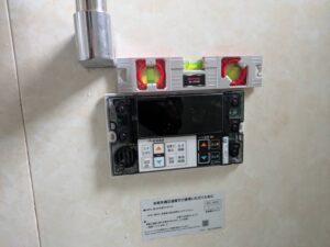 浴室リモコンの水平を確認しながら壁にきちんと取り付けます