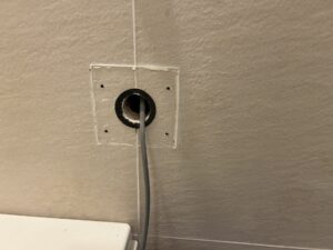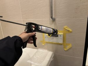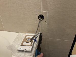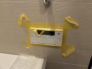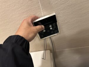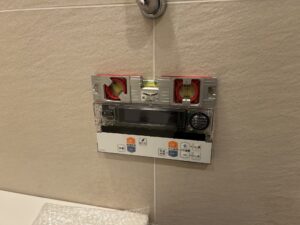 浴室リモコンの水平を確認しながら壁に取り付けます