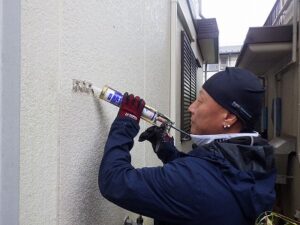 壁のビス穴に防水のコーキングを打ちます