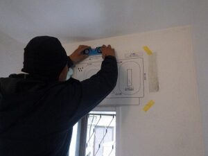 壁掛けの浴室乾燥暖房機の取り付け金具を取り付けます