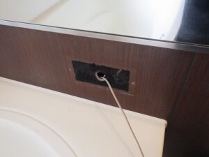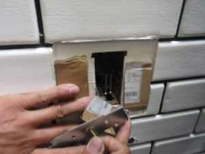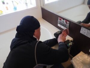 新しい浴室リモコンの水平を確認しながら壁に取り付けます