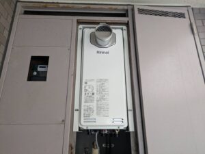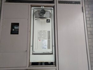 新しいリンナイ前方排気スリムタイプ給湯器をパイプスペースに設置します