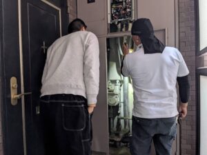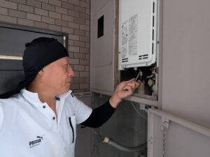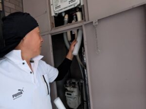 お客様と一緒に水漏れ・ガス漏れを確認中です。