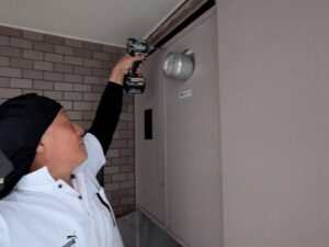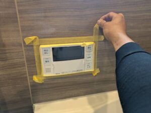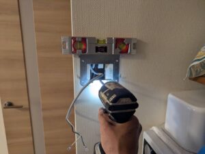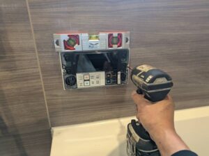 浴室リモコンの水平を確認しながら壁に取り付けます