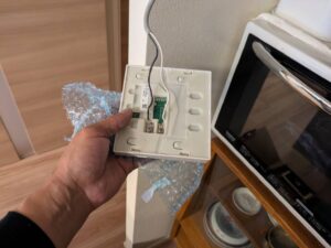 新しい台所リモコンの取り付け金具の水平を確認しながら取り付けます