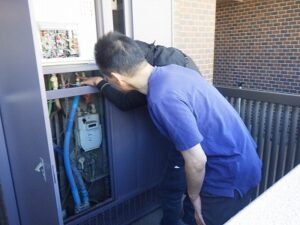 お客様と一緒に水漏れ・ガス漏れを確認中です
