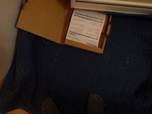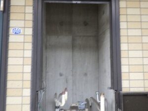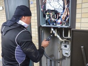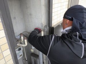 既存のリンナイ給湯器をパイプスペースより取り外します