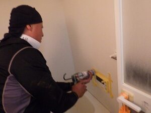 浴室リモコンの周りに防水のコーキングを打ちます