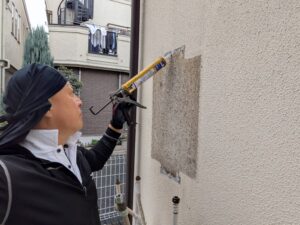 壁のビス穴に防水のコーキングを打ちます