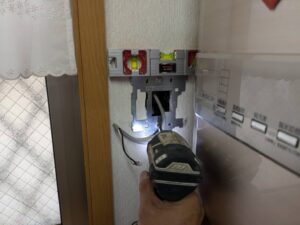 新しい台所リモコンの取り付け金具の水平を確認しながら壁に取り付けます
