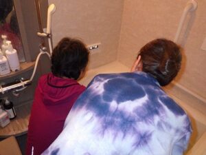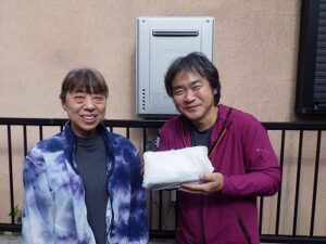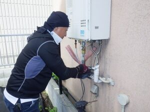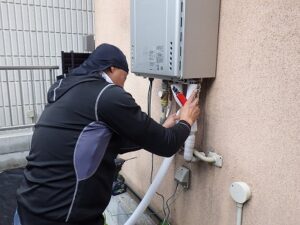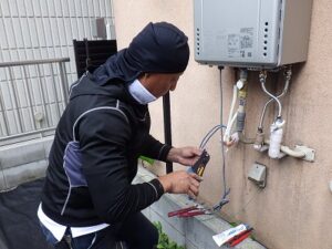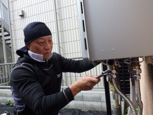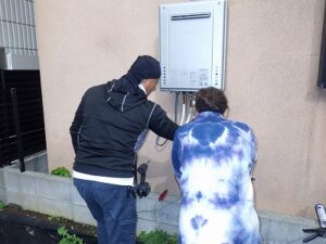 お客様と一緒に水漏れ、ガス漏れを確認中です。一緒にご確認いただきありがとうございます。