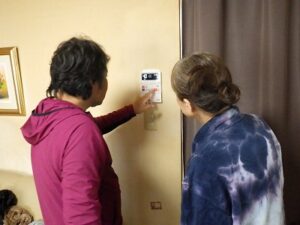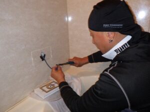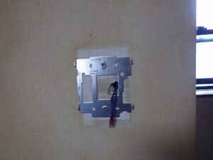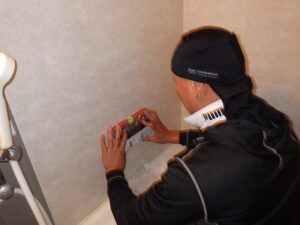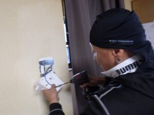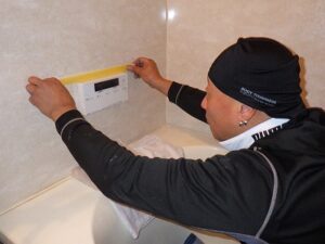 浴室リモコンの水平を確認しながら壁に取り付けます