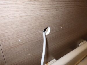写真の丸穴の部分が排気になるので、前方排気給湯器が設置されております。