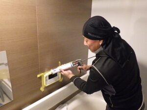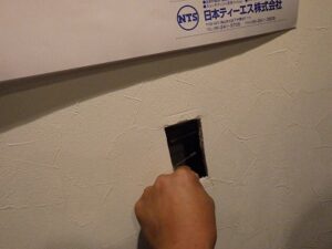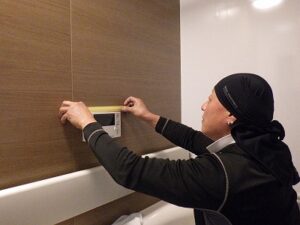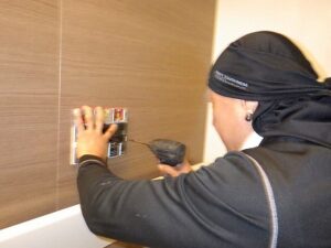 浴室リモコンの水平を確認しながら壁に取り付けます