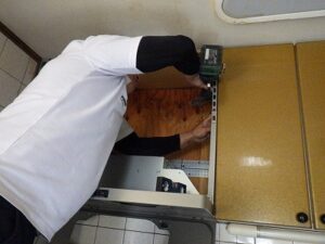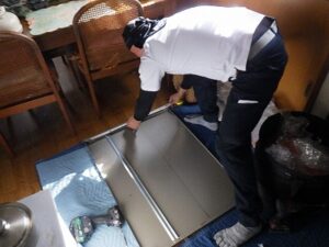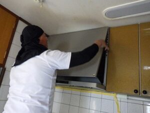 レンジフードのカバーを取り外して、プロペラ式の換気扇を取り外す準備をします
