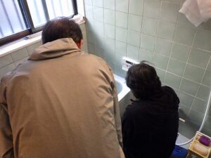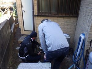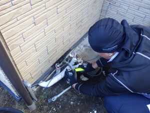 お客様と一緒に水漏れ・ガス漏れを確認中です。