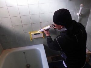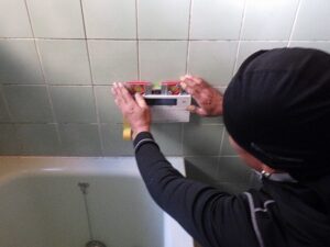 浴室リモコンの周りに防水のコーキングを打ちます
