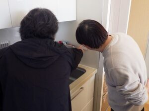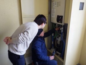 お客様と一緒に水漏れ・ガス漏れを確認中です