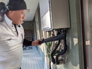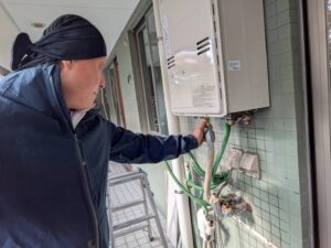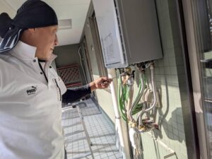 お客様と一緒に水漏れ・ガス漏れを確認中です。