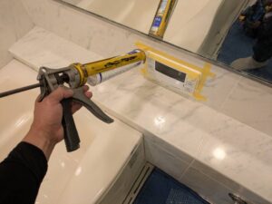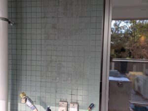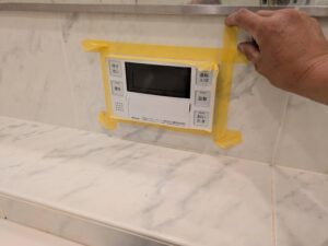 浴室リモコンの水平を確認しながら壁に取り付けます