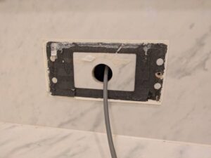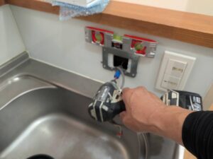 新しい台所リモコンの取り付け金具の水平を確認しながら壁に取り付けます