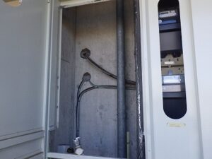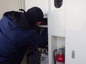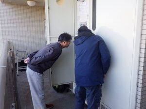 既存のノーリツ・東京ガスTES・熱源付前方排気給湯器をパイプスペースより取り外します