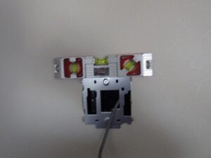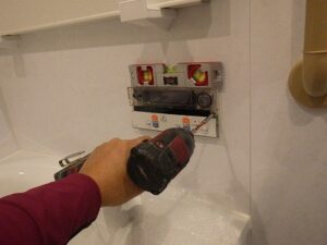 浴室リモコンの水平を確認しながら、壁にビスで固定します