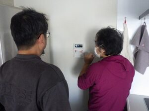 お客様に浴室リモコンの使い方の説明中です