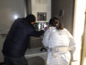 お客様と一緒に水漏れ・ガス漏れを確認中です。