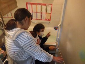 お客様に浴室リモコンの使い方の説明中です