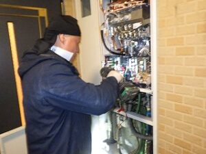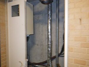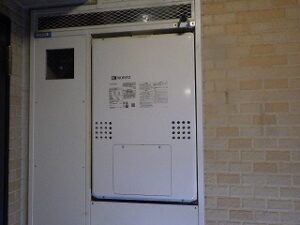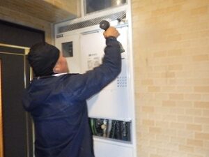 新しいノーリツTES・熱源付上方排気給湯器をパイプスペースに設置します