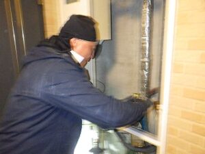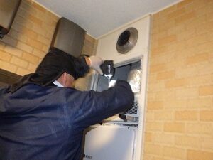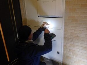 既存の松下TES・熱源付上方排気給湯器をパイプスペースより取り外します