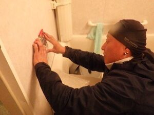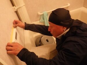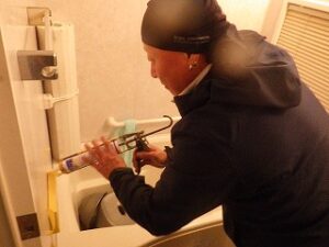 浴室リモコンの周りに防水のコーキングを打ちます