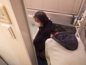 お客様に浴室リモコンの使い方の説明中です