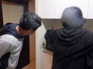 お客様に台所リモコンの使い方の説明中です