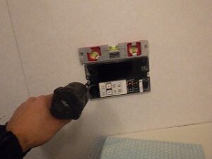 浴室リモコンの水平を確認しながら壁に取り付けます