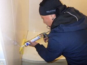 浴室リモコンの周りに防水のコーキングを打ちます