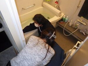 お客様に浴室リモコンの使い方の説明中です