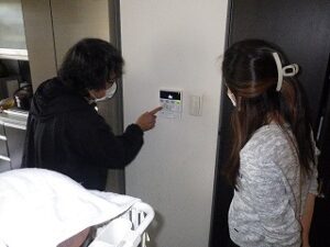 お客様に台所リモコンの使い方の説明中です