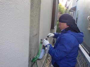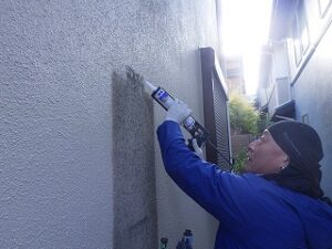 壁のビスに防水のコーキングを打ちます