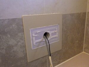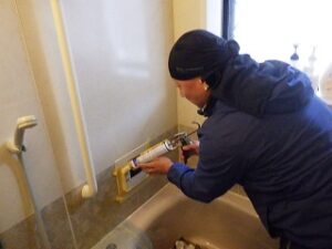 浴室リモコンの周りに防水のコーキングを打ちます