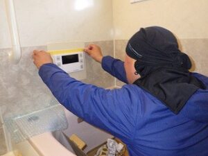 浴室リモコンの水平を確認しながら壁に取り付けます