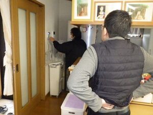 お客様に台所リモコンの使い方の説明中です