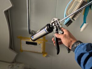 浴室リモコンの周りに防水のコーキングを打ちます