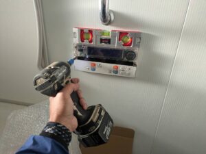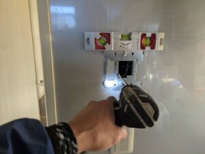 浴室リモコンの水平を確認しながら、ビスで壁に固定します