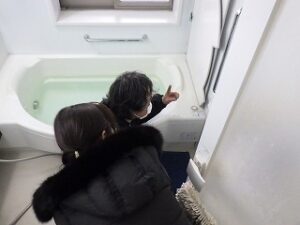 お客様に浴室リモコンの使い方の説明中です